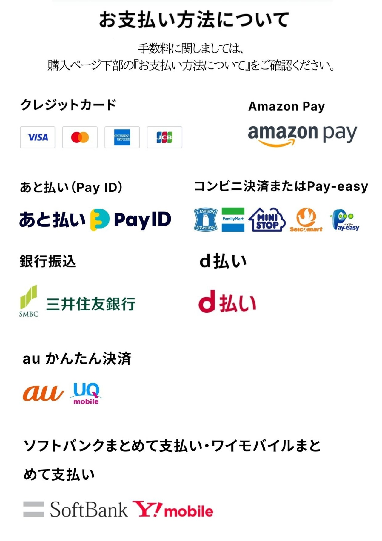 等多数の決済方法がございます。手数料に関しましては、購入ページ下部の『お支払い方法について』をご確認ください。